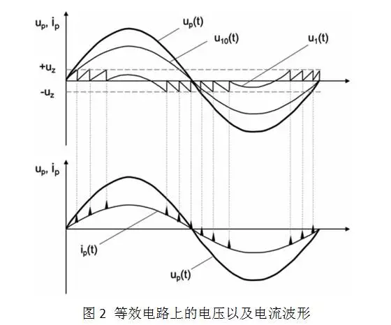 等效電路的電壓與電流波形如圖2所示。電壓UP(t)為施加在主絕緣上的系統(tǒng)電壓,U10(t)為空隙上的電壓。當(dāng)U10電壓升高到空隙的擊穿電壓UZ時(shí),空隙擊穿,C1兩端電壓下降,空隙絕緣恢復(fù),同時(shí)C2被充電,當(dāng)U10高于擊穿電壓Uz時(shí),以上過(guò)程重復(fù)發(fā)生。而每次局放時(shí),都將會(huì)在絕緣泄漏電流上疊加一個(gè)小的脈沖放電,如圖2所示。通過(guò)檢測(cè)放電脈沖發(fā)生的位置、時(shí)間以及幅值,我們可以對(duì)設(shè)備的絕緣運(yùn)行狀況進(jìn)行評(píng)價(jià)。
