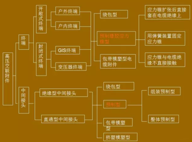 高壓電纜附件是由中低壓附件開展過來的。因此,110kV及以上交聯(lián)聚乙烯絕緣電纜終端和中心接頭的品種,與35kV及以下電纜終端和中心接頭的品種相似。
