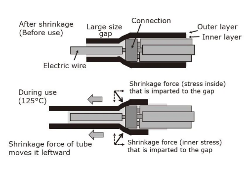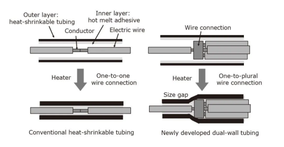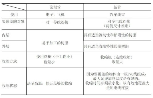 通常,傳統(tǒng)的雙壁管用于維護1對1的電線銜接??梢院翢o困難地用熱空氣或其他加熱設備(250-350°C)將管道縮短。另一方面,為了維護轎車線束的銜接,需求滿意以下四個特定條件: