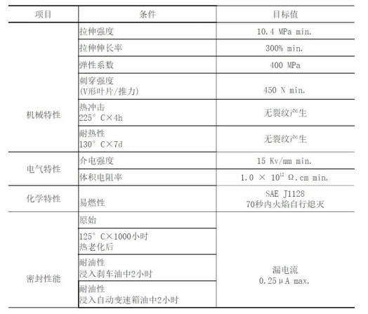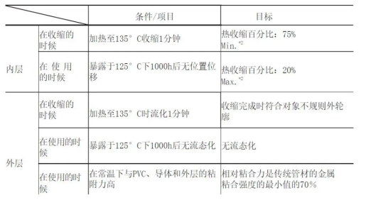 為了避免PVC線在熱縮短進程中發(fā)生熱降解,有必要將進程溫度控制在100°C或更低。為了滿意上述要求,咱們在自動縮短機中測量了最大加熱溫度和時刻,發(fā)現(xiàn)可以將管道加熱到135°C繼續(xù)一分鐘。將管道加熱到此溫度時,其外層有必要完全縮短,而內(nèi)層則需求活動并契合被遮蓋對象的不規(guī)則外部概括。另一方面,在125°C的運用溫度下,要求管道顯現(xiàn)出恰當?shù)慕^緣和密封功能,一起又不使管道和粘合劑位移。表2和表3別離顯現(xiàn)了用于新管的資料的開發(fā)方針及其方針特性。