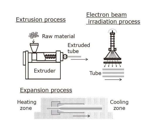 熱縮套管的制作進程如圖2所示。如圖所示,制作進程包括三個步驟:擠壓,電子束*3輻照和脹大。在擠壓進程中,樹脂被擠壓成管狀。在電子束輻照進程中,管子是交聯(lián)的。在脹大進程中,經(jīng)過加熱使交聯(lián)的管子軟化,然后施加內(nèi)部壓力以使管沿徑向脹大。最后,將管冷卻并固化為熱縮套管。