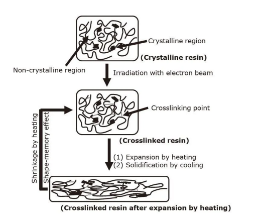 熱縮短管在受熱時縮短的原理如圖3所示。當電子束傳輸?shù)接山Y(jié)晶區(qū)和非結(jié)晶區(qū)組成的結(jié)晶樹脂*4時,樹脂分子在非晶區(qū)域相互銜接。成果,樹脂轉(zhuǎn)變?yōu)榫哂性诜蔷^(qū)域中構(gòu)成的交聯(lián)點的交聯(lián)樹脂。經(jīng)過加熱使交聯(lián)樹脂脹大,然后冷卻并固化為熱脹大的交聯(lián)樹脂。當將熱脹大的交聯(lián)樹脂加熱到等于或高于晶體區(qū)域的熔點的溫度時,晶體熔化并變軟。成果,因為存在交聯(lián)點,樹脂縮短成脹大前的形狀(形狀記憶效應)。(1)