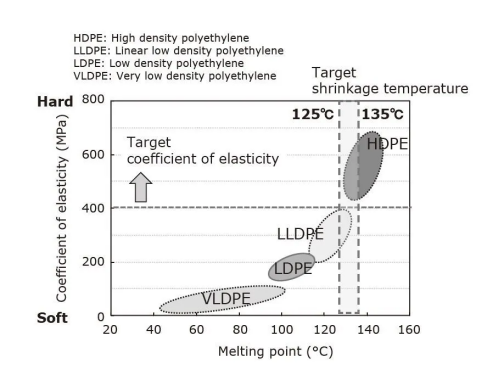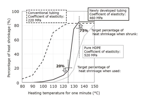 為了消除這些缺點,咱們將聚合物摻入聚乙烯中以優(yōu)化其熔點。成果,咱們開發(fā)了一種新的根據(jù)聚乙烯的外層資料。新資料在加熱到135°一分鐘后會縮短(熱縮短率:75%或更高),但在125°C的運用溫度下不會縮短(熱縮短率:20%或更低)或移位(圖6)。