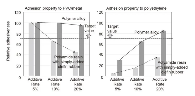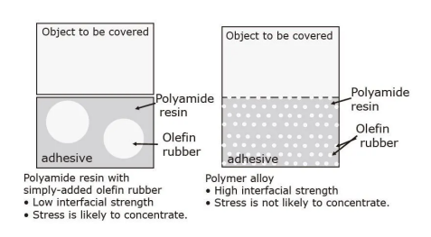 圖9.聚酰胺樹脂與簡單添加的烯烴橡膠和聚合物合金之間的粘合力差異