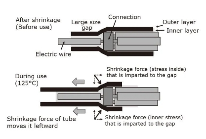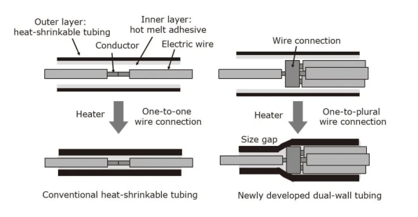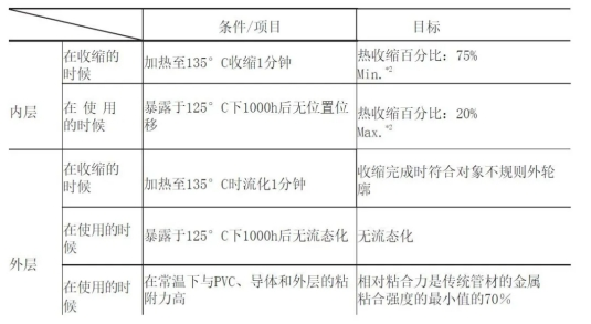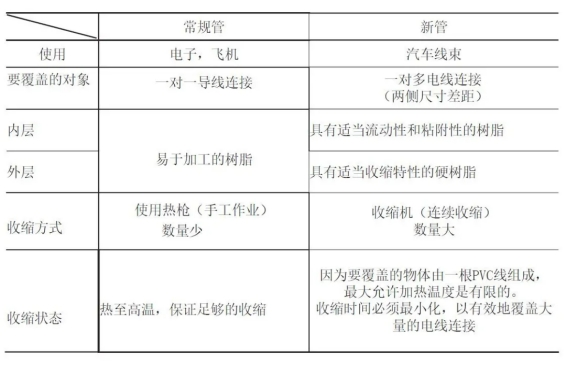 一般,傳統(tǒng)的雙壁管用于維護(hù)1對1的電線聯(lián)接??梢院翢o困難地用熱空氣或其他加熱設(shè)備(250-350°C)將管道縮短。另一方面,為了維護(hù)轎車線束的聯(lián)接,需求滿足以下四個特定條件: