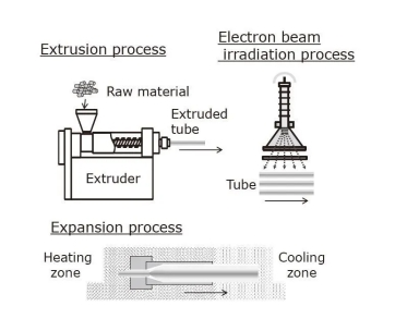 熱縮套管的制作進(jìn)程如圖2所示。如圖所示,制作進(jìn)程包括三個步驟:揉捏,電子束*3輻照和脹大。在揉捏進(jìn)程中,樹脂被揉捏成管狀。在電子束輻照進(jìn)程中,管子是交聯(lián)的。在脹大進(jìn)程中,經(jīng)過加熱使交聯(lián)的管子軟化,然后施加內(nèi)部壓力以使管沿徑向脹大。終究,將管冷卻并固化為熱縮套管。