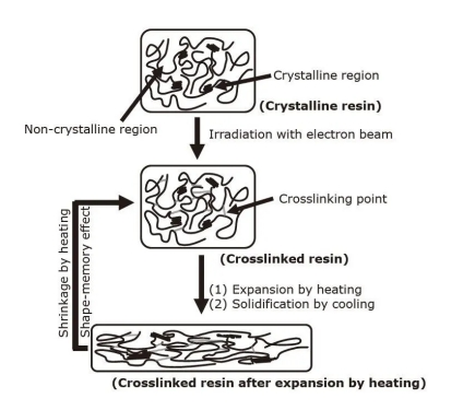 熱縮短管在受熱時(shí)縮短的原理如圖3所示。當(dāng)電子束傳輸?shù)接山Y(jié)晶區(qū)和非結(jié)晶區(qū)組成的結(jié)晶樹脂*4時(shí),樹脂分子在非晶區(qū)域互相聯(lián)接。作用,樹脂轉(zhuǎn)變?yōu)榫哂性诜蔷^(qū)域中構(gòu)成的交聯(lián)點(diǎn)的交聯(lián)樹脂。經(jīng)過加熱使交聯(lián)樹脂脹大,然后冷卻并固化為熱脹大的交聯(lián)樹脂。當(dāng)將熱脹大的交聯(lián)樹脂加熱到等于或高于晶體區(qū)域的熔點(diǎn)的溫度時(shí),晶體熔化并變軟。作用,因?yàn)榇嬖诮宦?lián)點(diǎn),樹脂縮短成脹大前的形狀(形狀回憶效應(yīng))。(1)