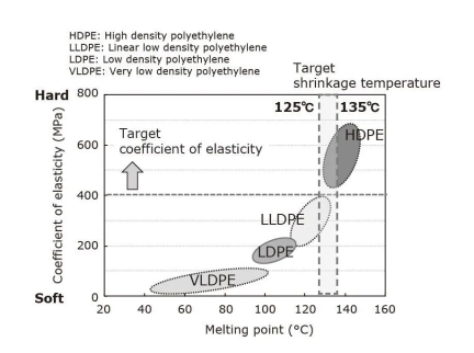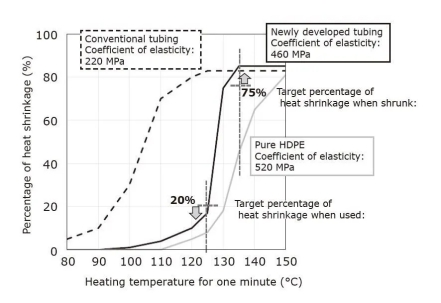 因?yàn)楦呙芏染垡蚁℉DPE)*5的彈性系數(shù)高于其他類型的聚乙烯,因此有望供應(yīng)高機(jī)械強(qiáng)度。但是,發(fā)現(xiàn)HDPE在加熱到135℃(略低于其熔點(diǎn)的溫度)一分鐘時(shí)不能充分縮短。相反,其他類型的聚乙烯在加熱到125°C時(shí)會縮短,但在125°C的運(yùn)用溫度下會軟化,然后在徑向方向上發(fā)生內(nèi)應(yīng)力并滑出其預(yù)期方位(圖5)。