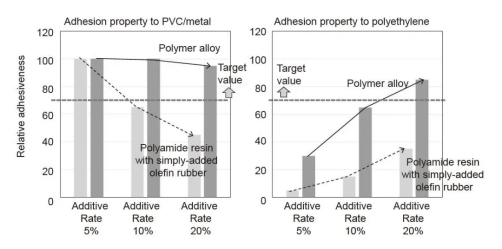 圖9.聚酰胺樹脂與簡略增加的烯烴橡膠和聚合物合金之間的粘合力差異