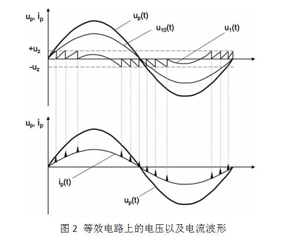 等效電路的電壓與電流波形如圖2所示。電壓UP(t)為施加在主絕緣上的體系電壓,U10(t)為空地上的電壓。當(dāng)U10電壓升高到空地的擊穿電壓UZ時(shí),空地?fù)舸?,C1兩端電壓降落,空地絕緣恢復(fù),同時(shí)C2被充電,當(dāng)U10高于擊穿電壓Uz時(shí),以上進(jìn)程反復(fù)發(fā)作。而每次局放時(shí),都將會(huì)在絕緣走漏電流上疊加一個(gè)小的脈沖放電,如圖2所示。經(jīng)過(guò)檢測(cè)放電脈沖發(fā)作的位置、時(shí)辰以及幅值,我們可以對(duì)設(shè)備的絕緣運(yùn)轉(zhuǎn)狀況停止點(diǎn)評(píng)。
