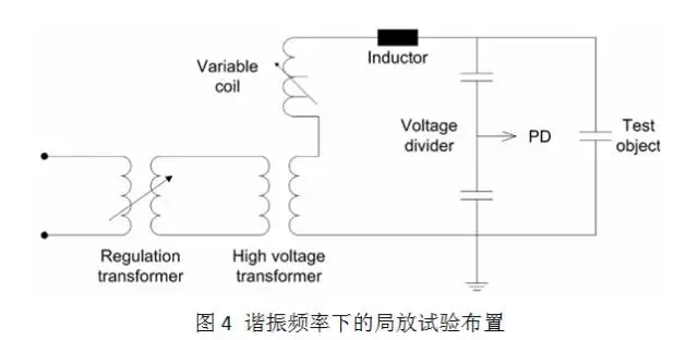 圖4為諧振頻率下的局放實(shí)驗(yàn)安頓表示圖,與工頻電壓下的安頓基本共同。根據(jù)IEC62067(≥245kV)與IEC60840(<245kV)規(guī)范,電纜的實(shí)驗(yàn)頻率范圍為20至300Hz。實(shí)驗(yàn)安頓選用串聯(lián)諧振的方法,實(shí)驗(yàn)頻率如下所示。