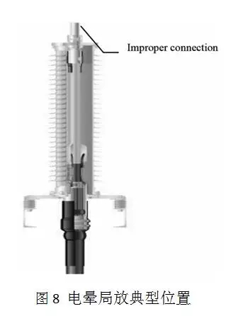 當(dāng)電暈起始點(diǎn)為高壓側(cè)時(shí),在負(fù)半周可以檢測(cè)到局放發(fā)作,如圖7所示;當(dāng)電暈發(fā)作在零電位區(qū)域時(shí),局放發(fā)作在正半周。圖8展示了野外終端的電暈易發(fā)作區(qū)域。招致電暈發(fā)作的首要緣由有:不規(guī)范裝置、毛邊、尺度不恰當(dāng)?shù)?。普通?lái)說(shuō),這些缺陷都是可以消弭的,而且關(guān)于電纜設(shè)備的平安運(yùn)轉(zhuǎn)不會(huì)發(fā)作較大影響。電暈類局放首要發(fā)作在野外終端,普通不會(huì)在中心接頭號(hào)設(shè)備上呈現(xiàn)。