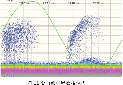 沿面放電首要發(fā)作在電場(chǎng)切線上,放電量較其他局放方式更大。沿面放電的局放量在100 pC至1000 pC,而且總是在過(guò)零點(diǎn)之后呈現(xiàn)。由于沿面放電閃絡(luò)間隔更大,對(duì)設(shè)備的絕緣功用影響至關(guān)重要。根據(jù)局放放電相位圖(圖11),第三象限下的放電量要大于第一象限。