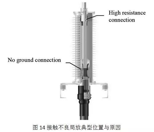 關(guān)于電纜附件,該類型的局放高發(fā)毛病點(diǎn)會(huì)集在金具銜接處,如圖14所示。典型毛病有:壓接收與導(dǎo)線的截面積尺度不合,招致接觸面過(guò)小,構(gòu)成局放。繼續(xù)的局放會(huì)構(gòu)成金具發(fā)熱,究竟招致電纜接頭毛病。另一個(gè)典型毛病為:裝置進(jìn)程中涂抹硅脂過(guò)多,招致線芯與內(nèi)半導(dǎo)之間有一層絕緣,構(gòu)成電位差。