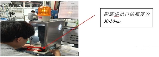 3.2按將熱縮套管移至U形端子或超聲波焊接處的中心方位,并將其置于熱烘槍的風(fēng)口中心,高度為緊貼保護(hù)罩的上表面, (間隔烘槍口的高度為25MM,即保護(hù)罩的厚度),見下面示意圖