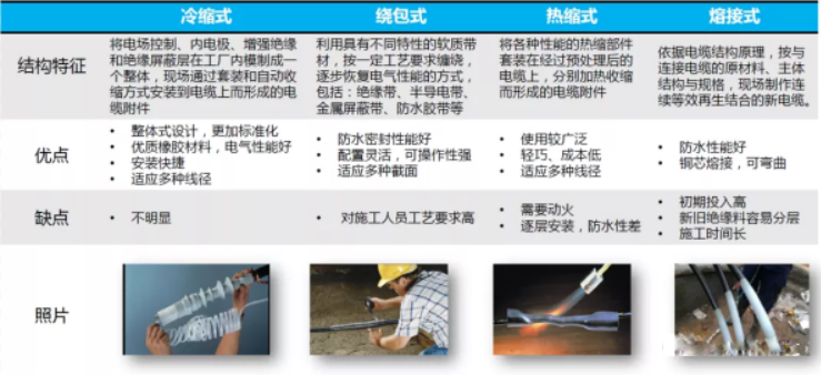 除了供電區(qū)域外,還要看該供電區(qū)域內(nèi)大多數(shù)附件采用的材料和裝置方式。圖1羅列了配電電纜附件首要品種的優(yōu)缺點(diǎn)。