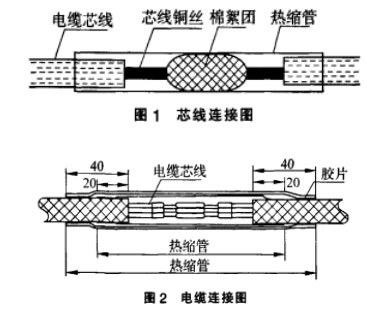 專用工具剝出一定長(zhǎng)度的電纜芯線和芯線銅絲,并確保芯線及銅絲不受損傷。芯線銅絲外露長(zhǎng)約1cm.芯線不錫焊.用熱縮套管連接.兩頭芯線之間斷開處填塞棉絮并使其緊密,見圖1。