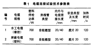 芯線連接后在接頭處套上中= (1.5~1. 8)D的熱縮套管D為電纜直徑),熱縮套管熱縮后再套上相同或稍大直徑的熱縮套管,形成雙層熱縮接頭,見圖2.f測(cè)并記錄每根芯線的斷開電阻,電纜連接參數(shù)見表1。