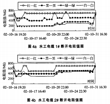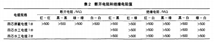 從試驗(yàn)測(cè)得結(jié)果來看.15d內(nèi)四芯屏蔽電纜各芯線的斷開電阻和芯線之間的絕緣電阻在加壓前后均> 500MΩ四芯水工電纜的絕緣電阻加壓前后也均> 500MΩ見表2。四芯水工電纜各芯線的斷開電阻在加壓后有明顯的減小,但均> 180MΩ在持續(xù)加壓過程中基本處于穩(wěn)定,僅隨